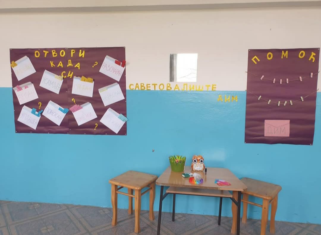 „Саветовалиште ДИМ“ је кутак који треба да помогне ученицима у саморегулацији својих осећања. На паноу се налазе коверте са називима осећања (срећан, поносан, усамљен, заљубљен, у дилеми и сл.) Ученици у зависности од расположења проналазе савете у одговарајућим ковертама. У колико ниједано од понуђених решења им не одговара или имају неки други проблем, обраћају се директно ДИМ тиму (Дијана, Ивана, Марина). Своје питање постављају анонимно под шифром, убацујући папир у сова касицу. Тим ће им одговорити и покушати да реши проблем. Своје успехе и срећне моменте, као и решења проблема, уколико желе, могу да поделе са другима.