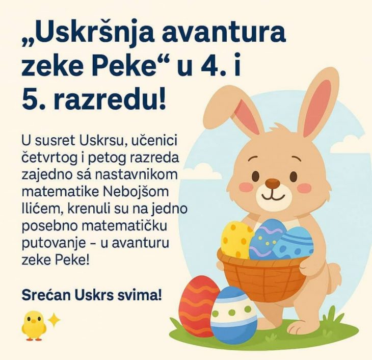 „Ускршња авантура зеке Пеке“ у 4. и 5. разреду! У сусрет Ускрсу, ученици четвртог и петог разреда, заједно са наставником математике Небојшом Илићем, кренули су на једно посебно математичко путовање – у авантуру зеке Пеке! Кроз низ задатака израђених у облику приче, ученици су решавали изазове који су пратили зеку на његовом путу ка испуњењу ускршње мисије. Бројали смо јаја, делили чоколаде, сабирали, одузимали и на крају откључали капију до радости и осмеха. На креативан начин, повезали смо математику са празничном атмосфером и развијали логичко размишљање, машту и сарадњу. Зека Пека је стигао – а наши ученици су поново показали да учење може бити забавно и празнично!